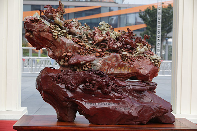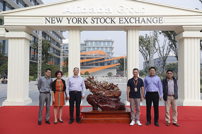 夏海钧总裁(左二)与阿里巴巴首席执行官陆兆禧(右二)共同为大型寿山石雕摆件《万马奔腾》揭幕